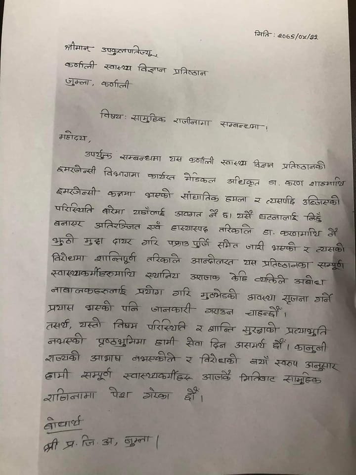 कर्णाली स्वास्थ्य विज्ञान प्रतिष्ठानका डाक्टर तथा स्वास्थ्यकर्मीद्वारा सामूहिक राजीनामाको घोषणा