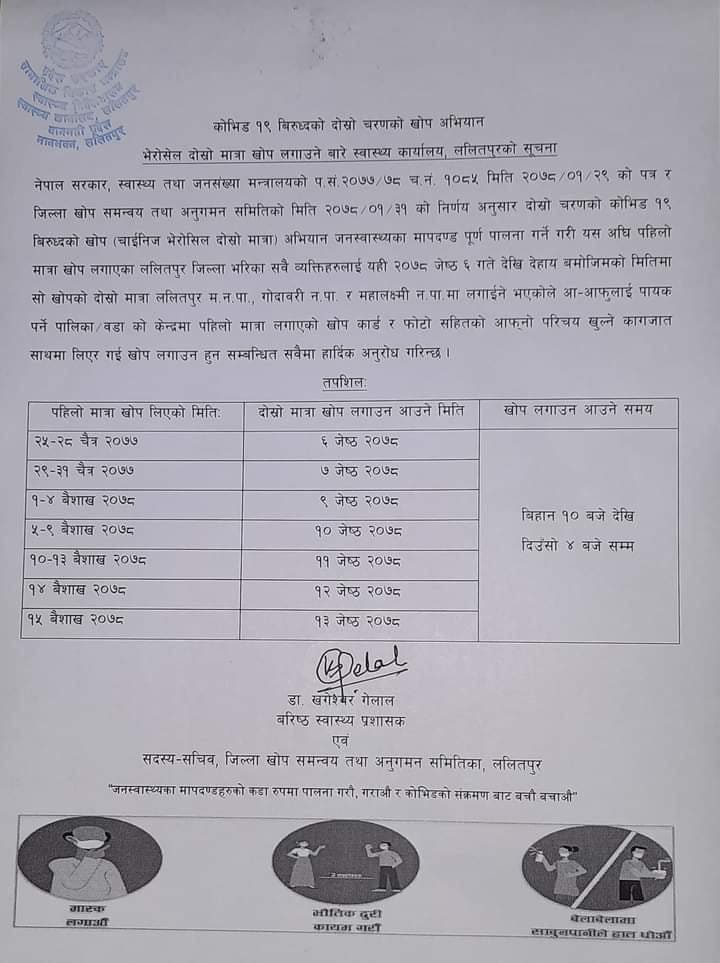 स्वास्थ्य कार्यालय ललितपुरले आज सूचना प्रकाशित गरी पहिलो चरणका खोप लगाएकाहरुलाई दोस्रो चरणको खोप लगाउनलाई स्थान र मिति तोकेको छ ।