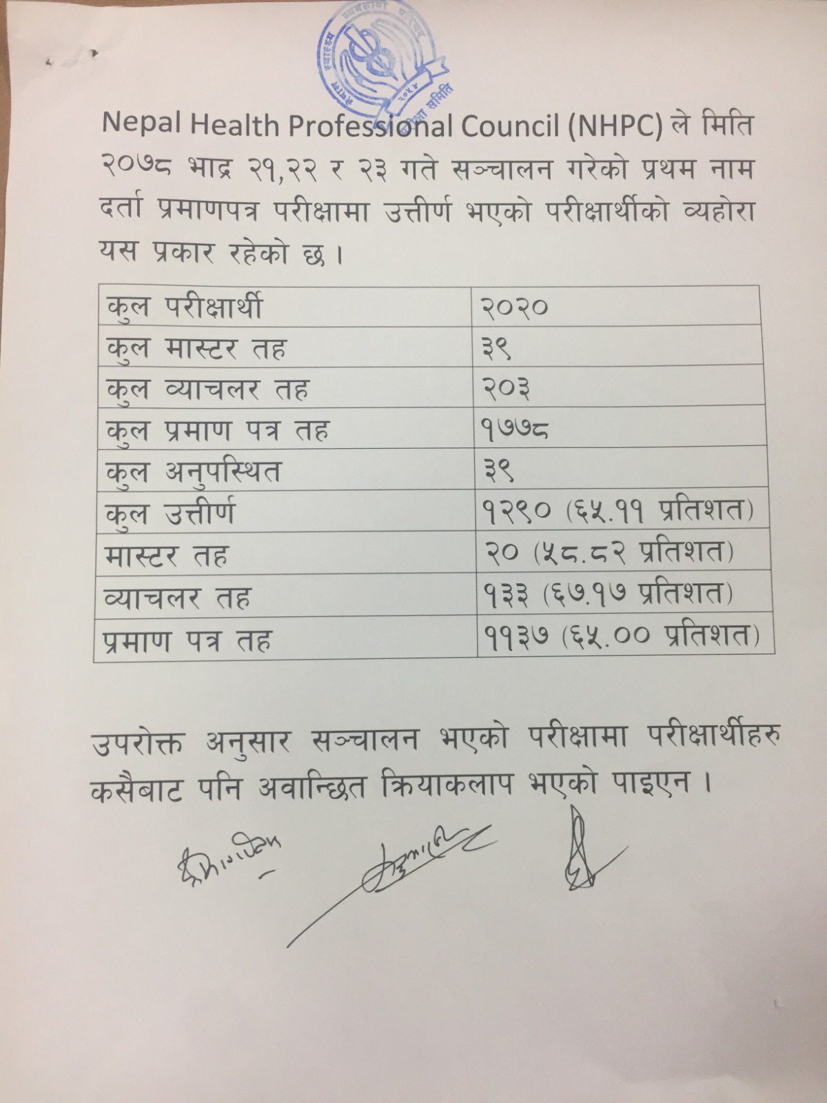 यस परीक्षामा २०२० जनाले परीक्षा दिएका थिए । ३९ जना परीक्षामा अनुपस्थित थिए । २०२० मध्ये १२२० जना परीक्षमा उतीर्ण भएका छन् । स्नाकोत्तर तहमा ३९ जना सहभागी भएकोमा २० जना उतीर्ण भएका छन् । यो भनेको ५८.८२ प्रतिशत हो । त्यसैगरी स्नातक तहमा २०३ परीक्षार्थी सहभागी भएकामा १३३ जना उतीर्ण भएका छन् ।