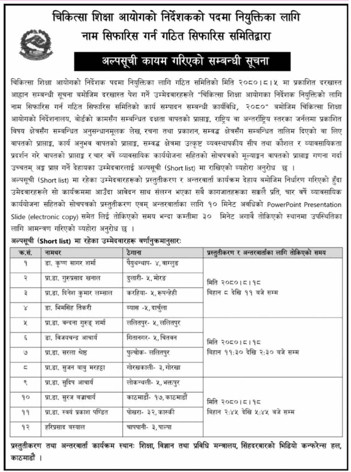 निर्देशकका लागि नाम सिफारिस गर्न गठित समितिले अघिल्लो मंगलबार सूचना निकाल्दै ७ दिनभित्र आवेदन दिन भनेको थियो। समितले मापदण्ड तथा प्रत्यायन निर्देशनालय, समन्वय तथा प्राज्ञिक उन्नयन निर्देशनालय, परीक्षा निर्देशनालय र नेसनल बोर्ड अफ मेडिकल स्पेसियालिटिज गरी तीन वटा निर्देशनालय र एक बोर्डमा निर्देशक नियुक्तिका लागि नाम सिफारिस गर्ने छ।