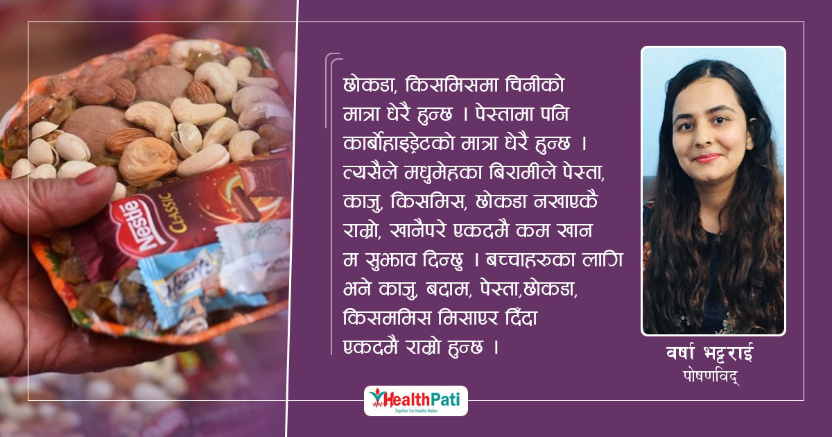 काजुमा कार्र्बोहाइड्रेटको मात्रा धेरै हुन्छ । त्यसैले मधुमेहको समस्या भएका व्यक्तिले काजु एकदमै कम खानुपर्छ । उनीहरुले ओखर र बदाममा बढी जोड दिनुपर्छ । मधुमेहको समस्या भएका दाजुभाइका लागि दिदिबहिनीहरुले काजु, पेस्ता, छोकडा, किसमिसभन्दा बदाम र ओखरमा जोड दिँदा राम्रो होला । छोकडा, किसमिसमा चिनीको मात्रा धेरै हुन्छ । पेस्तामा पनि काब्रोहाइड्रेटको मात्रा धेरै हुन्छ । त्यसैले मधुमेहका बिरामीले पेस्ता, काजु, किसमिस, छोकडा नखाएकै राम्रो, खानैपरे एकदमै कम खान म सुझाव दिन्छु ।