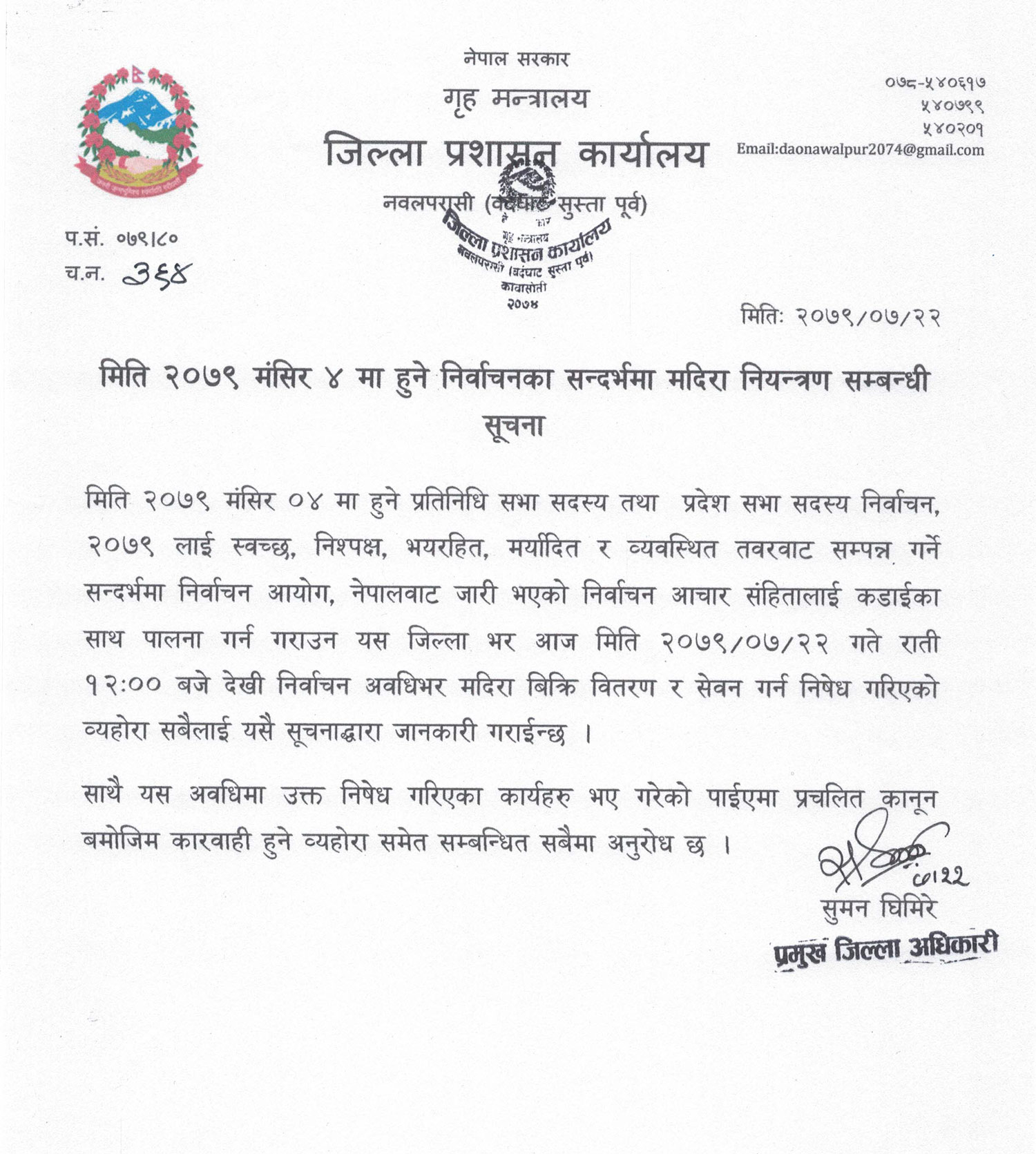 जिल्ला प्रशासन कार्यालय नवलपरासी पूर्वले हिजो सूचना जारी गरी गएराति १२ बजेदेखि लागू हुनेगरी मदिरा निषेध गरेको हो ।