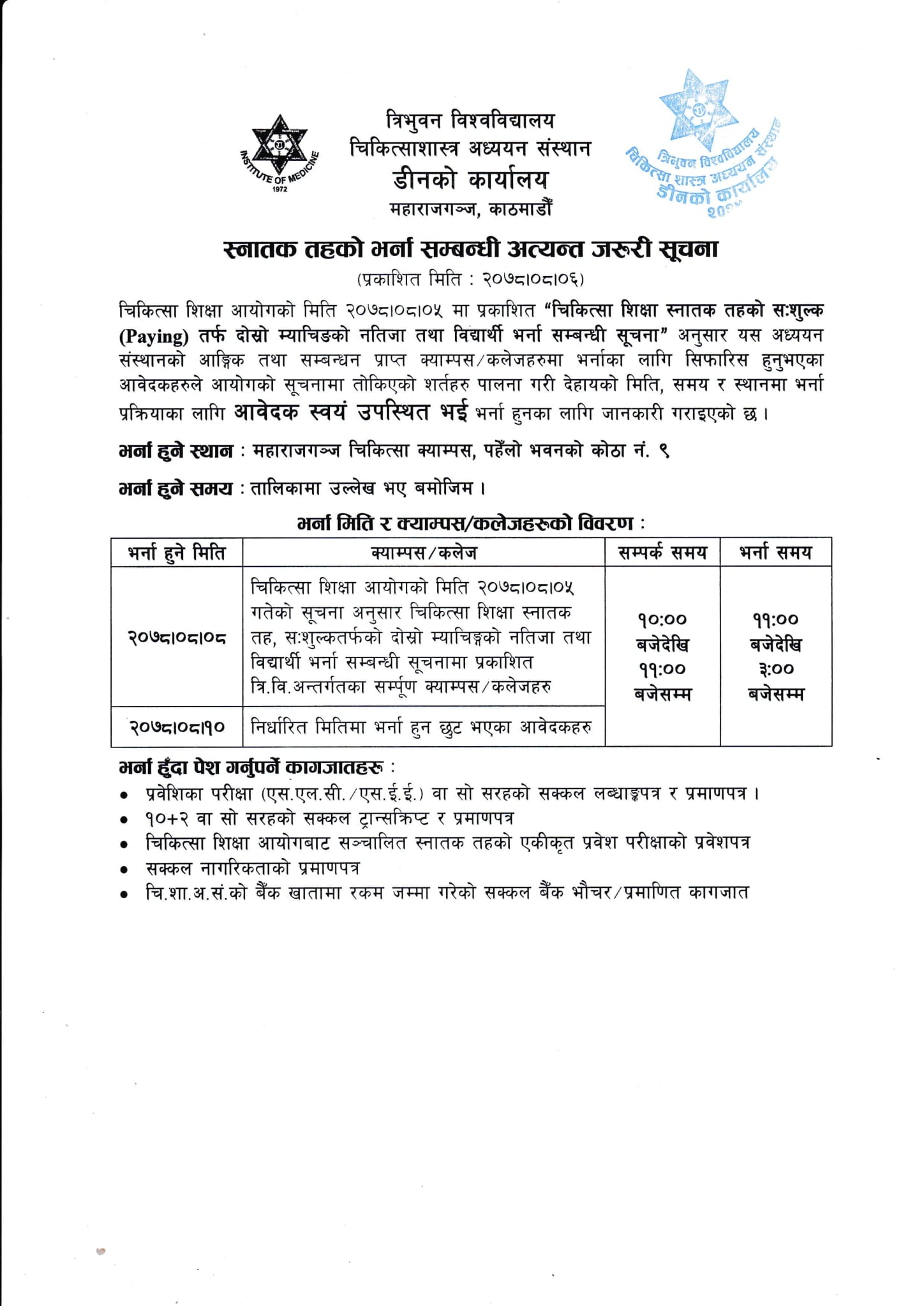 चिकित्सा शास्त्र अध्ययन संस्थान (आइओएम)ले स्नातक तहको स:शुल्क तर्फ भर्ना सूचीमा सिफारीस भएका उम्मेदवारहरुलाई भर्ना गर्न सुचित गरेको । चिकित्सा शिक्षा आयोगको सिफारीसमा परेका उम्मेदवारहरुलाई मंसिर १० गतेभित्र भर्ना हुन आइओएमले आग्रह गरेको छ ।