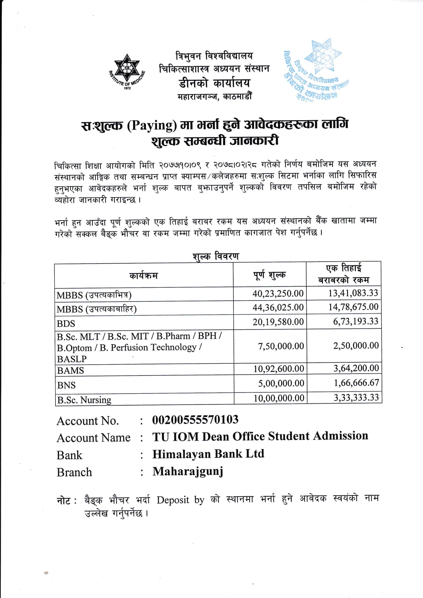 उपत्यकाभित्र एमबीबीएसको शुल्क ४० लाख २३ हजार २५० र उपत्यकाबाहिर ४४ लाख ३६ हजार २५ रुपैंया पर्नेछ । भर्ना अवधिमा एक तिहाई रकम बुझाउनुपर्नेछ ।