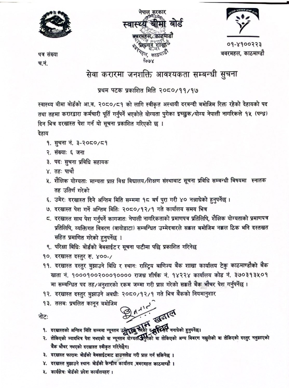स्वास्थ्य बीमा बोर्डले करार सेवामा कर्मचारी माग गरेको छ । बोर्डले आज सूचना जारी गरी सूचना प्रविधि सहायक पदमा ६ जना कर्मचारी माग गरेको हो ।