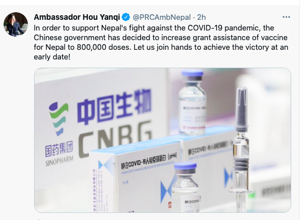 उहाँले ट्वीटमा लेख्नुभएको छ, ‘कोरोना विरुद्ध लड्न नेपाललाई थप खोप सहयोग गर्ने निर्णय भएको छ ।’ यसअघि चीनले ५ लाख मात्रा खोप सहयोग गर्ने प्रतिवद्धता जनाएको थियो ।
