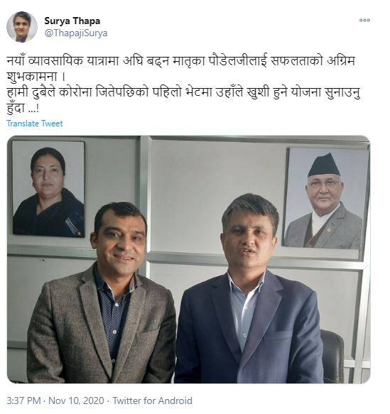 एकैछिनमा त्यो ट्विट हटाइयो र प्रधानमन्त्रीका प्रेस सल्लाहकार सूर्य थापाको व्यक्तिगत ह्याण्डलबाट सोही भनाइ र सोही फोटो सहितको ट्विट पोस्ट भयो । यसले स्पष्ट पार्यो कि प्रेस सल्लाहकार थापा झुक्किनु भएको रहेछ ।