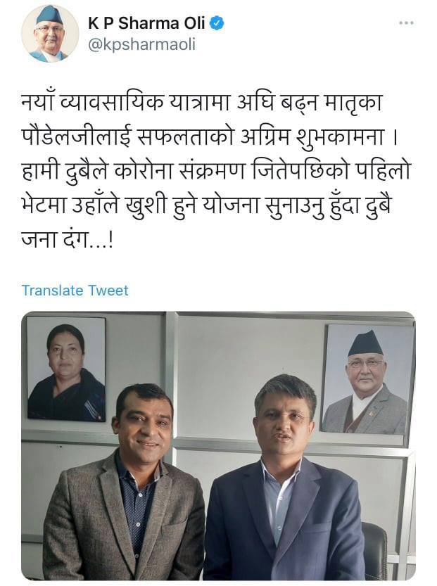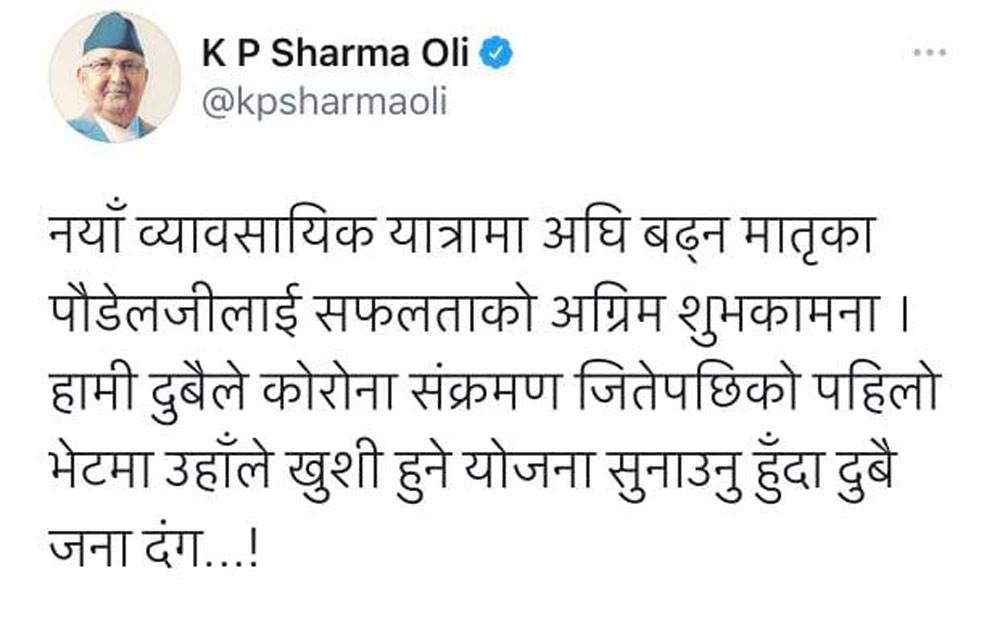 काठमाडौं । मंगलबार दिउँसो प्रधानमन्त्री केपी शर्मा ओलीको आधिकारिक ट्विटर ह्याण्डलबाट आएको एक ट्विटले सबैलाइै अचम्भित बनायो । ट्विटरमा प्रधानमन्त्रीले लेख्नुभएको थियो ‘नयाँ व्यवसायिक यात्रामा अघि बढ्नका लागि मातृका पौडेलजीलाई अग्रिम शुभकामना ।