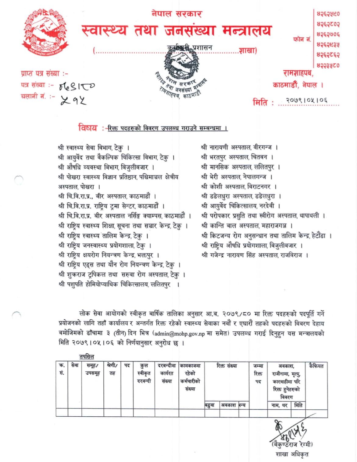 स्वास्थ्य मन्त्रालयद्ले २६ वटा निकायलाई त्यहाँ रिक्त रहेका पदहरुको विवरण माग गरेको छ ।