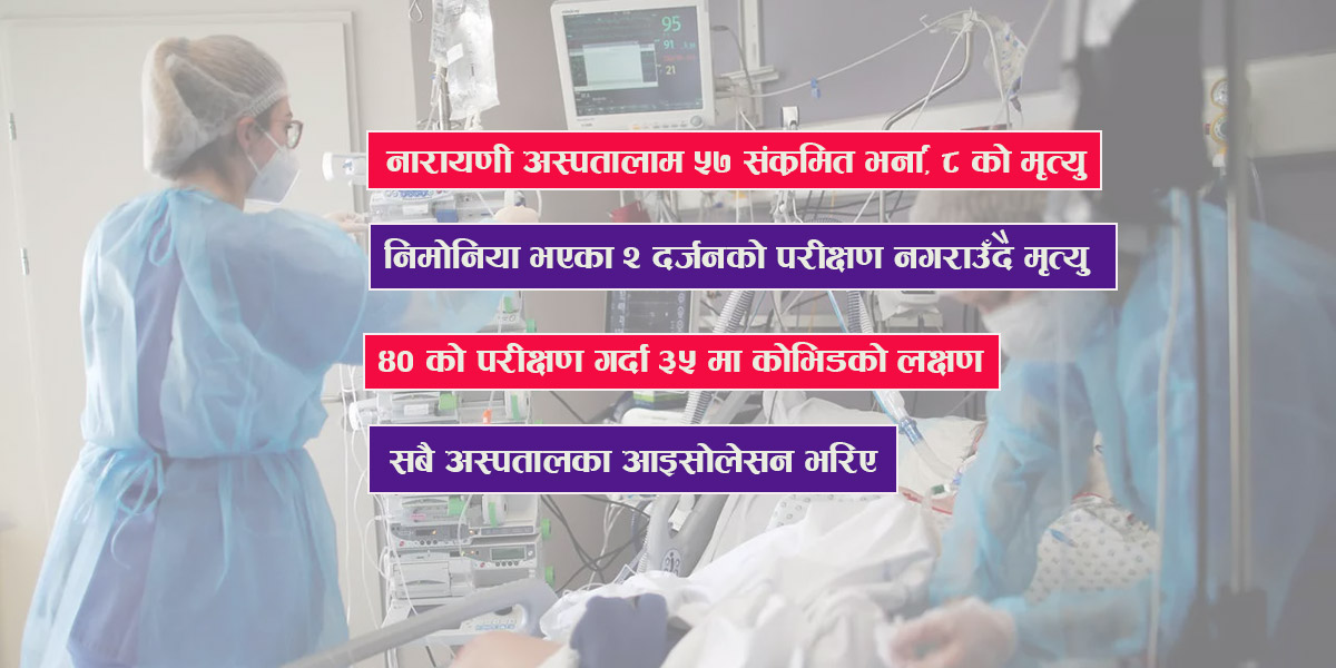 विगत दुई साताका निमोनिया देखिएका तर कोभिड परीक्षण नै नगराइए वीरगन्जका विभिन्न निजी अस्पतालहरुमा २ दर्जन भन्दा धेरै बिरामीको मृत्यु भएको छ। ती मध्ये थुप्रै बिरामीहरूअस्पताल भर्ना भएको २४ घण्टा पनि नपुगी उनीहरुको मृत्यु भएको डा. सिंहले जानकारी दिनुभयो।